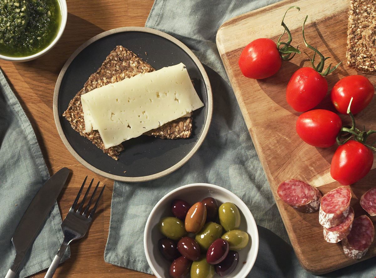 Treat your guests to a savory cheese plate with Sweet honey with walnuts, pesto and crispbread, olives, fresh tomatoes, cured sausage all served with slices of mild Arla Havarti. Delicious!