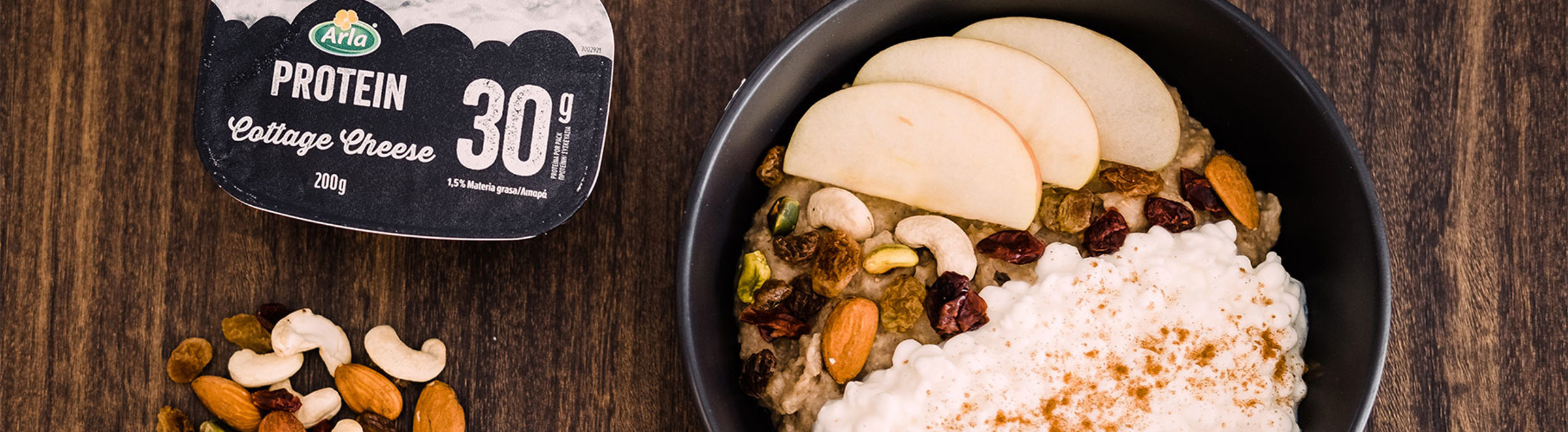 Top the blend with Arla® Cottage Cheese, few slices of banana, mixed nuts and raisins and/or any other favourite topping(s).