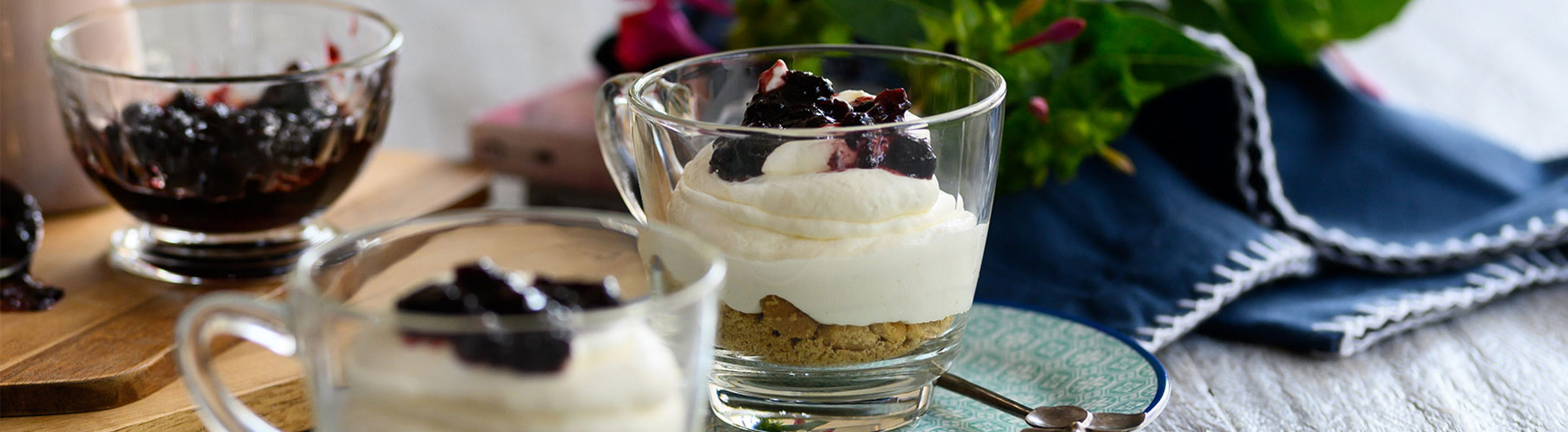 When the cheesecake in individual bowls are cooled down, take out of the fridge and serve with some red fruit marmalade on top.