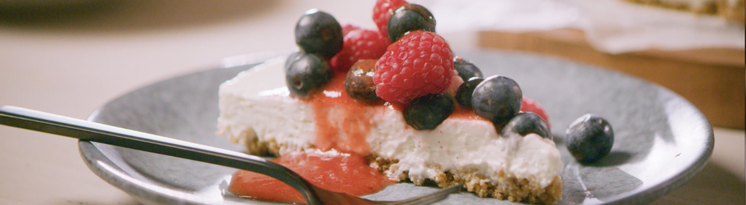 To make the filling, split the vanilla pod and scrape out the seeds and mix with sugar and Arla® Natural Cream Cheese to a fluffy consistency. Gently blend whipped cream in the cream cheese mixture. Pour the filling into the tin and let it cool in the refrigerator until the cheesecake filling sets.