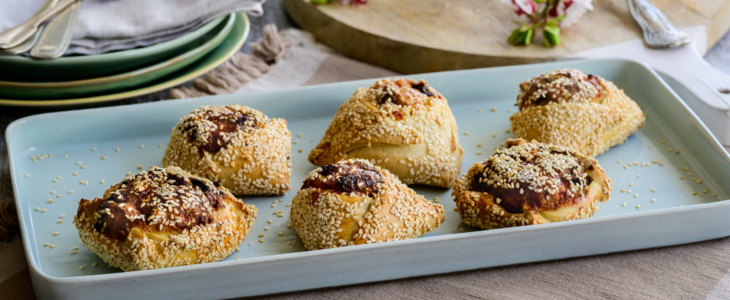 Place the appropriate amount of filling, close the edges, brush the flaounas with the egg, sprinkle with sesame and place them on a baking sheet lined with parchment paper.