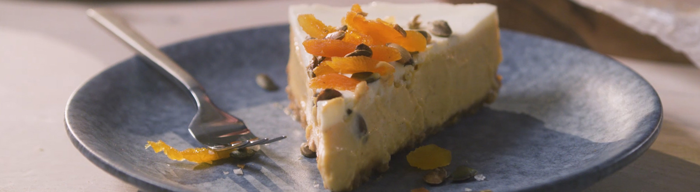 Mix pumpkin seeds with honey and spread onto a piece of parchment paper. Sprinkle with salt and bake for 15 minutes at 100°C or until the pumpkin seeds are slightly golden. Decorate the pumpkin cheesecake with dried apricots and honey roasted pumpkin seeds.