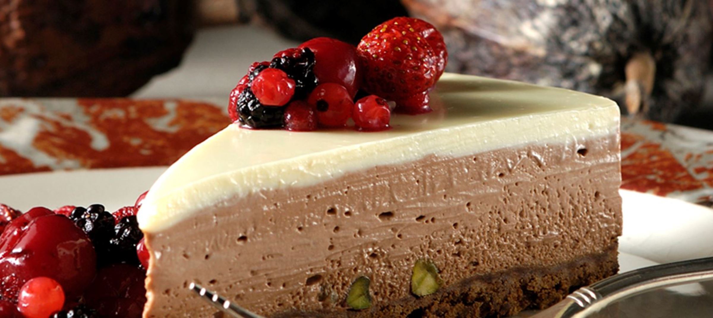 Cut the chocolate into small pieces. Heat the cream at 90C and spread it over the chocolate. Stir well and make a ganache. Soften the cheese and add the chocolate. Finally, add the italian meringue stirring softly. Spread the cream over the cold biscuit base and put it in the fridge until the cream is stabilised.