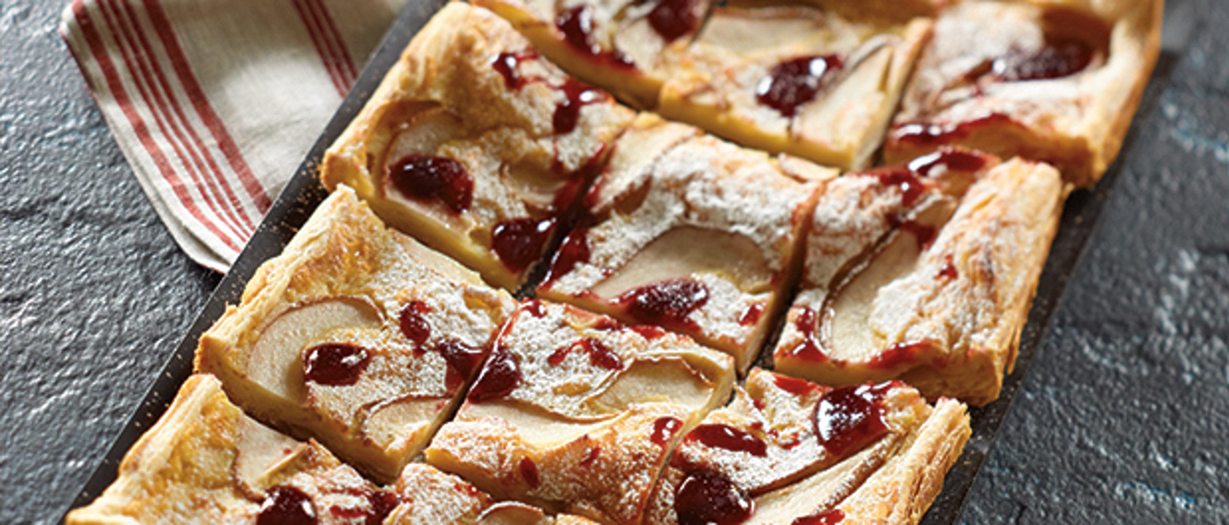 Vaporiser un moule à cuisson de 9 po x 13 po avec un enduit à cuisson antiadhésif. Rouler la pâte de la même dimension que le moule, avec un bord de 1/2 po sur les côtés. Verser le mélange dans le moule et répartir uniformément avec une spatule. Garnir des tranches de poire et du Fromage Havarti. Cuire 30 à 35 minutes, ou jusqu’à léger et doré. Retirer du four. Déposer des cuillères à thé de confiture de framboises à différents endroits sur le dessus et laisser refroidir. Au moment de servir, saupoudrer de sucre à glacer et couper en carrés.