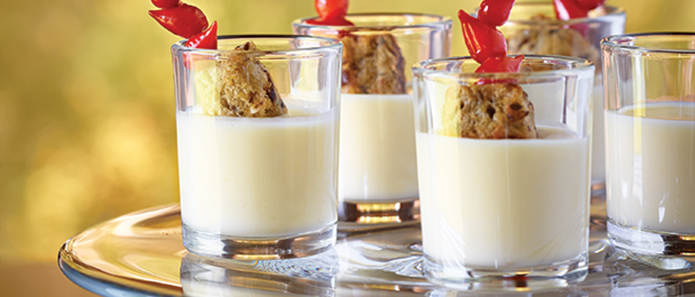 Verser dans des verres à pousse-café et servir avec diverses crudités sur cure-dent.
