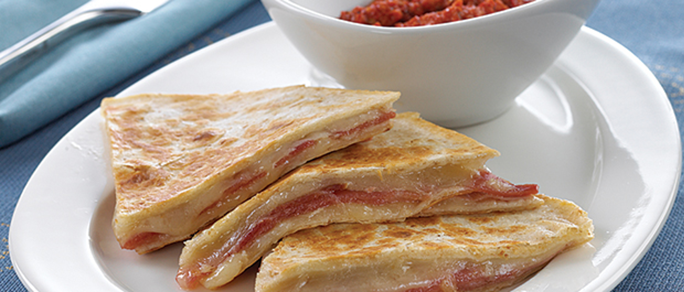 Répartir le jambon et le Havarti également sur les 4 tortillas. Plier les tortillas en deux. Badigeonner d'huile d'olive et déposer dans un poêlon moyen. Cuire jusqu'à doré des deux côtés. Répéter pour les autres tortillas. Trancher et servir immédiatement