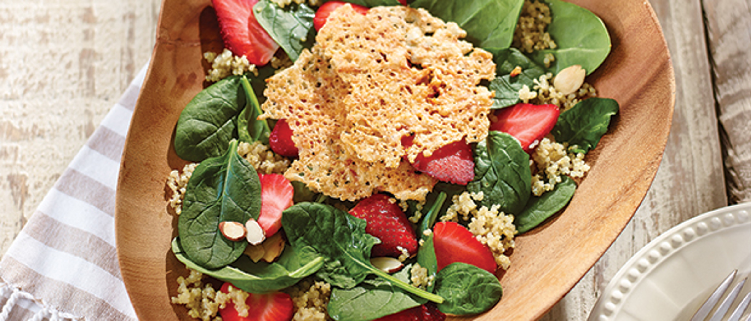 Montage de la salade : Dans un bol, combiner les jeunes épinards, les fraises, le quinoa et les amandes grillées. Verser un léger filet de vinaigrette et remuer. Servir avec les tuiles de Havarti