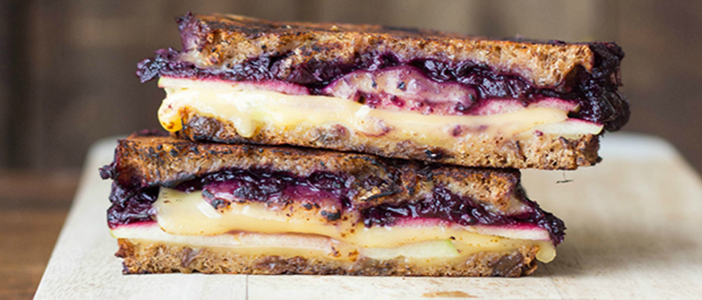 - Chauffer une presse à panini à chaleur moyenne-élevée. Vaporiser d'enduit à cuisson. Mettre une tranche de pain sur la presse à panini. Déposer la moitié du gouda et les pommes tranchées. Déposer une cuillérée de compote de bleuets sur les pommes, saupoudrer de cannelle et verser un filet de réduction balsamique. Couvrir du reste de gouda. Placer une deuxième tranche de pain sur le dessus et fermer le couvercle de la presse à panini. Laisser cuire jusqu'à ce que le pain soit doré et que le fromage soit fondu, environ 3 à 4 minutes.