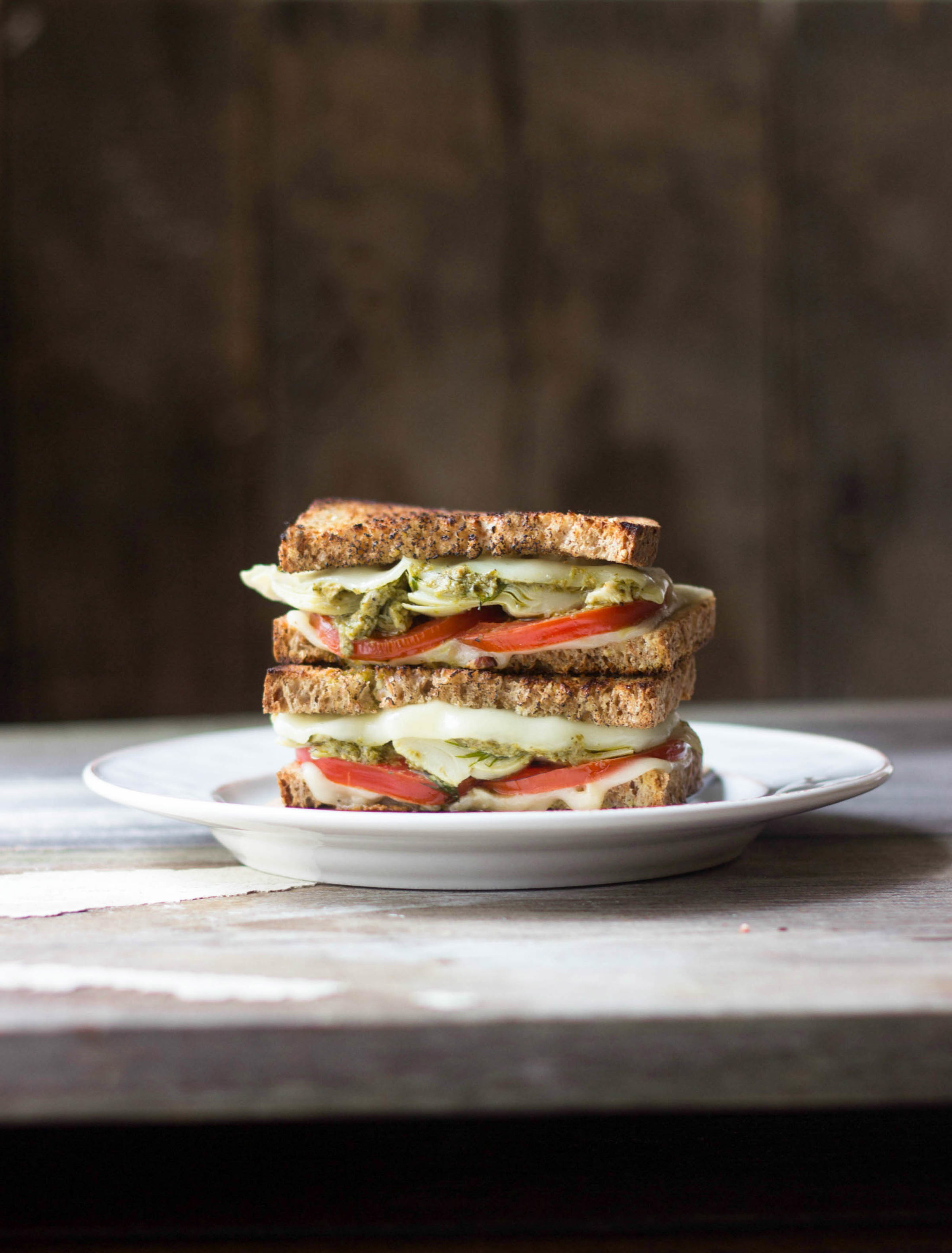 - Chauffer une presse à panini à chaleur moyenne-élevée. Vaporiser d'enduit à cuisson. Tartiner chaque tranche de pain avec 1/2 c. à soupe de pesto au basilic. Mettre une tranche de pain sur la presse à panini. Déposer une tranche de Havarti crémeux Arla®, les morceaux d'artichaut, l'aneth, les tranches de tomate et la deuxième tranche de Havarti. Placer une deuxième tranche de pain sur le dessus et fermer le couvercle de la presse à panini. Laisser cuire jusqu'à ce que le pain soit doré et que le fromage soit fondu, environ 3 à 4 minutes.