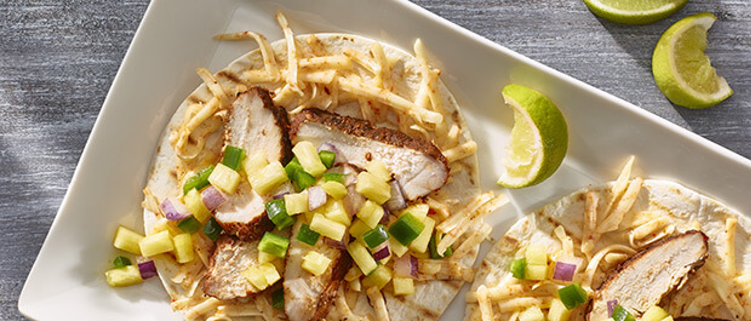 Couper le poulet en tranches diagonales. Pour assembler les tacos, répartir également le poulet sur chaque tortilla; garnir de salsa à l'ananas et de fromage Havarti.