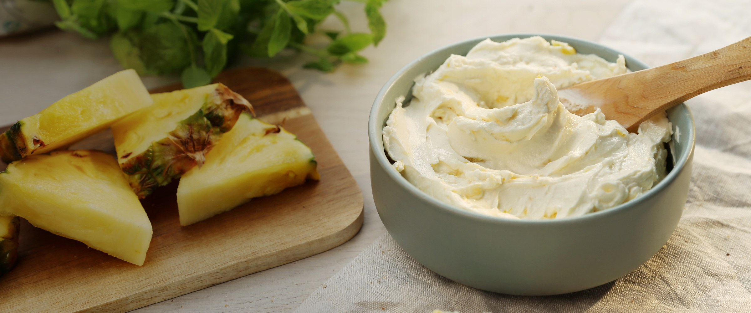 Embrace the sour-sweet tones of delicious Arla Cream Cheese with Pineapple. Flecked with small chunks of pineapple, made from only four natural ingredients and no artificial additives and a refreshing pineapple taste, it’s the ideal cheese for spreading on crackers, buns, sandwiches and wraps or even as a naturally tasty addition to cheesecakes filled with goodness!