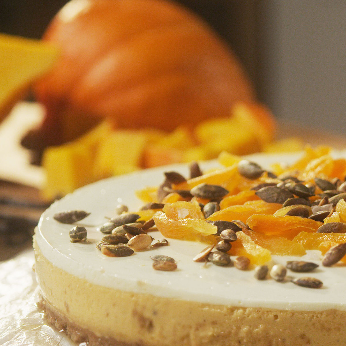 Mix pumpkin seeds with honey and spread onto a piece of parchment paper. Sprinkle with salt and bake for 15 minutes at 100°C or until the pumpkin seeds are slightly golden. Decorate the pumpkin cheesecake with dried apricots and honey roasted pumpkin seeds.