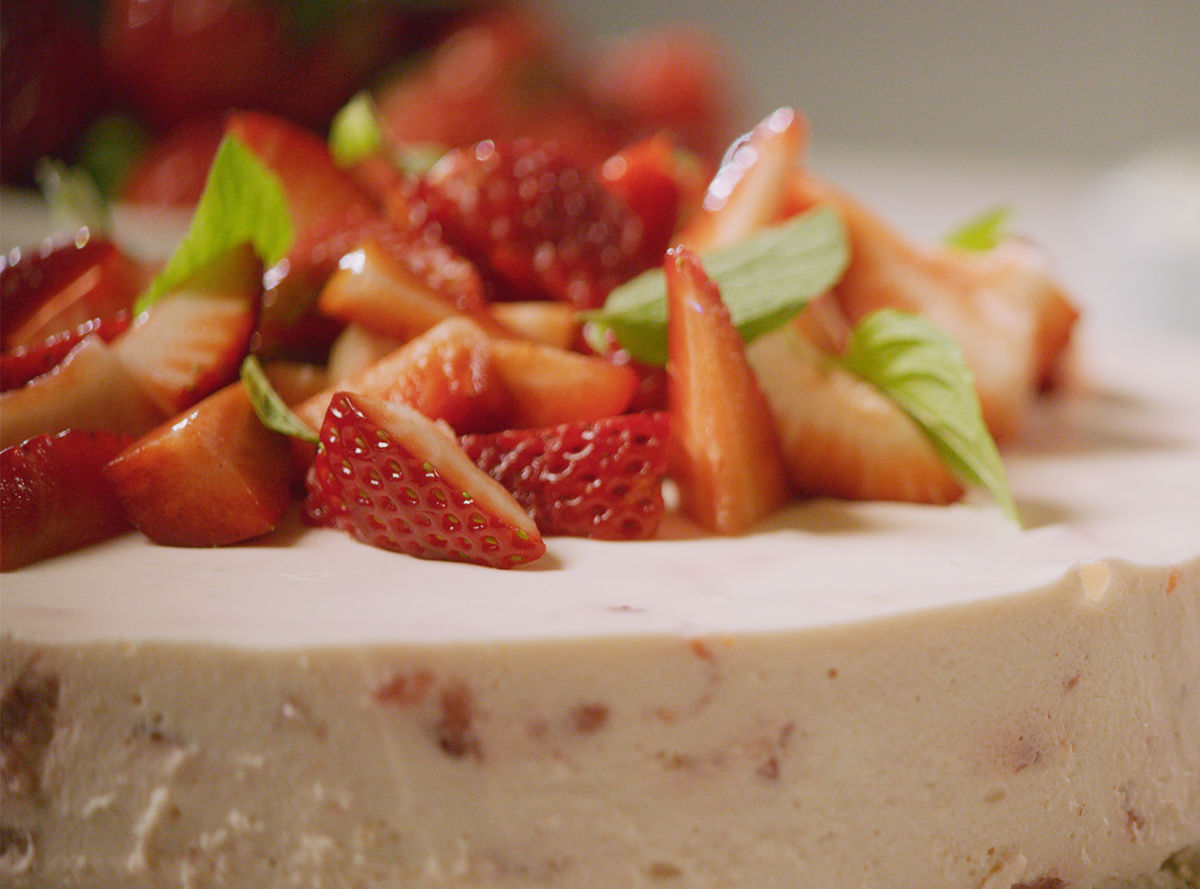 Remove the side of the cake tin and decorate with 100 g strawberries cut into quarters.